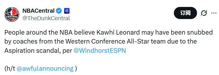 西部全明星的七个替补名额由教练们投票选出,但他们跳过了莱昂纳德。根据文霍斯特的爆料,或许是受到了他与快船赞助商存在“虚假代言”争议的影响。教练组与联盟方面大概率不希望,这项NBA年度盛会的焦点被一个仍在调查中的事件夺走。