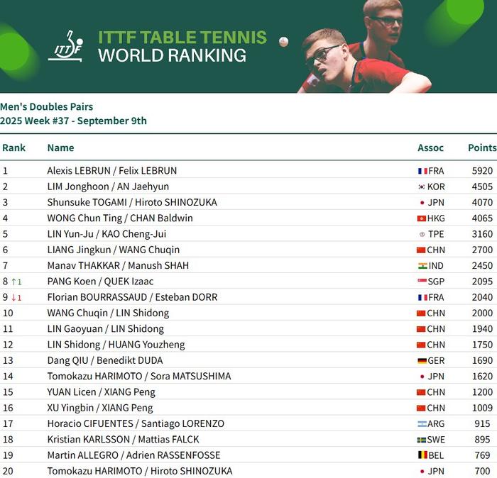 男单:林诗栋9850分、王楚钦位列前二,梁靖崑位列第6,向鹏位列第9