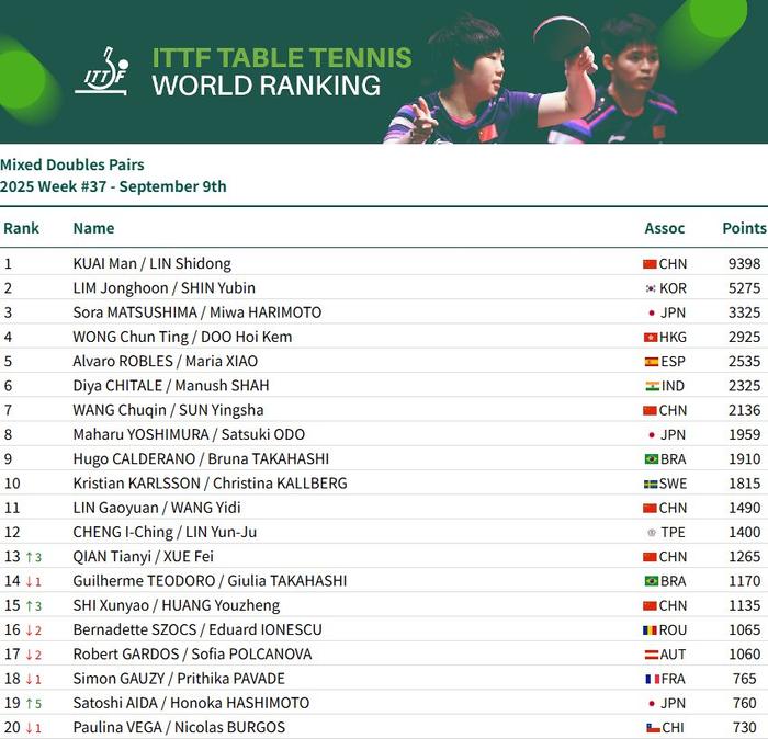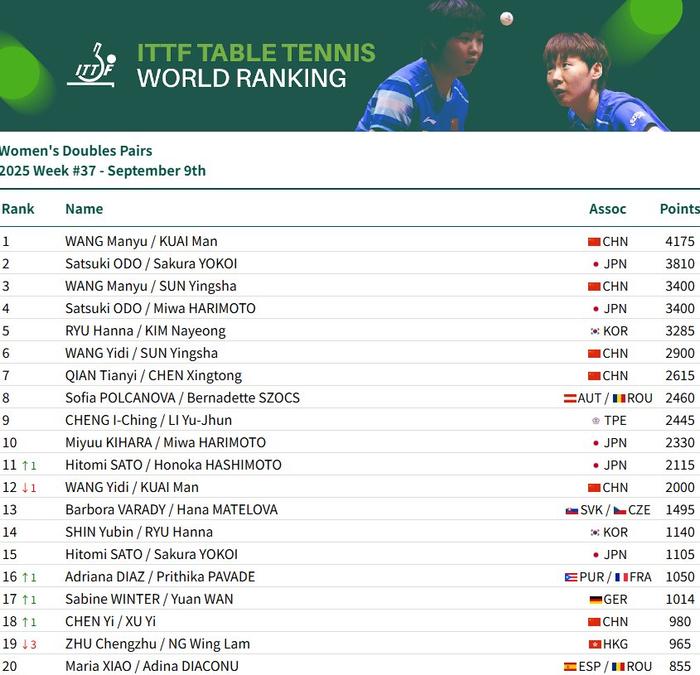 B体育平台-2025国际乒联排名公布,孙颖莎领跑女单,国乒五项前十占多席